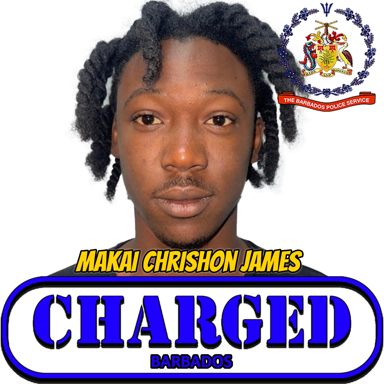 The Barbados Police Service (TBPS) Major Crime Unit (MCU), has arrested and formally charged Makai Chrishon James, 20 years of Pegwell Boggs, Christ Church for the following offence: